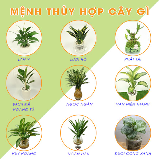 Người mệnh Thủy hợp những cây có lá, thân, hoa hoặc chậu có màu xanh dương, xanh thẫm, đen (màu bản mệnh) hoặc màu trắng, ghi, xám (màu mệnh Kim sinh Thủy). Trồng những cây này sẽ giúp gia chủ tiền vào như nước, tài vận hanh thông. Đồng thời, những người mệnh này nên trồng cây thủy sinh để gia tăng thêm điềm lành trong phong thủy.